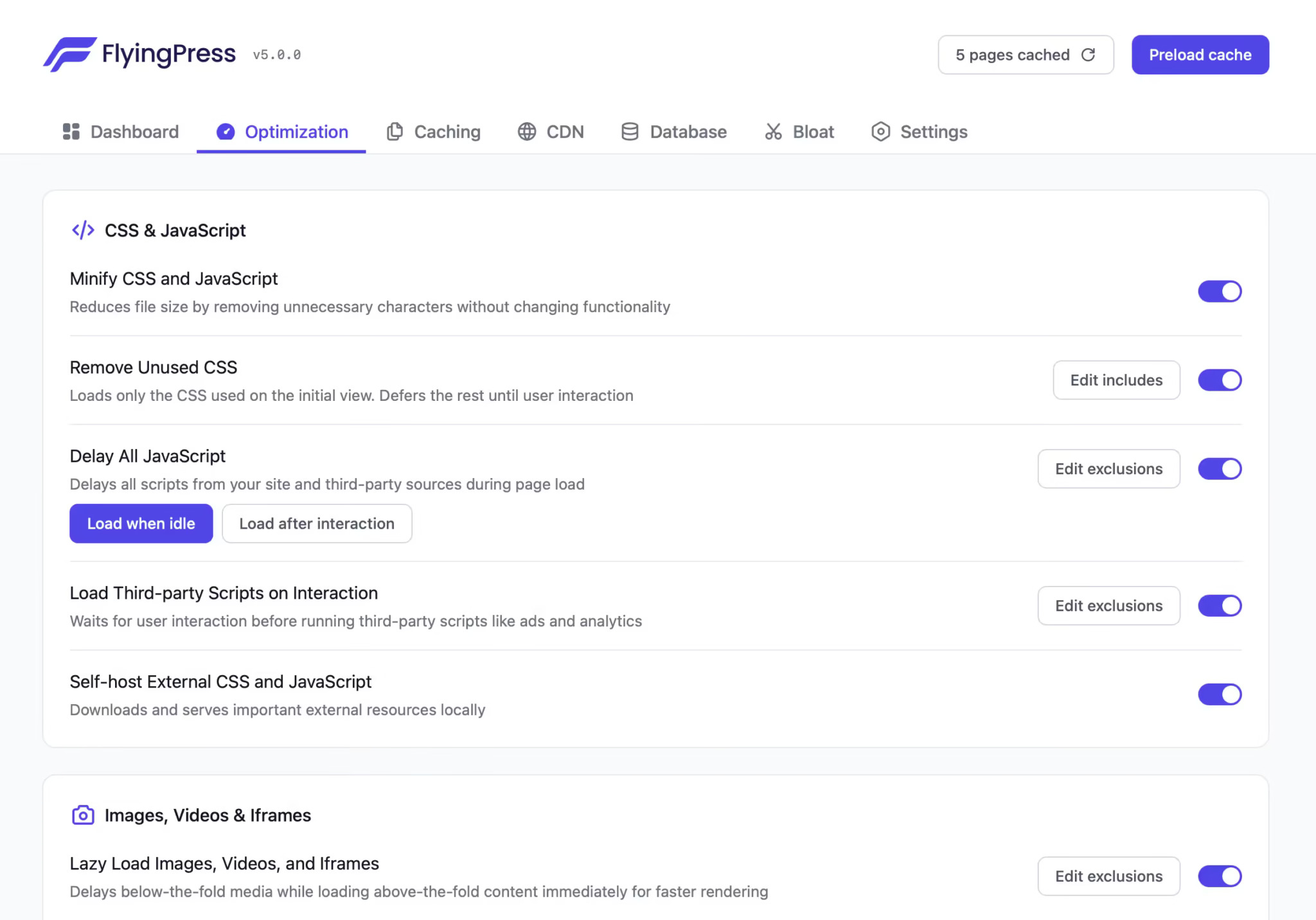 FlyingPress 支持对多种资源进行 延迟加载: