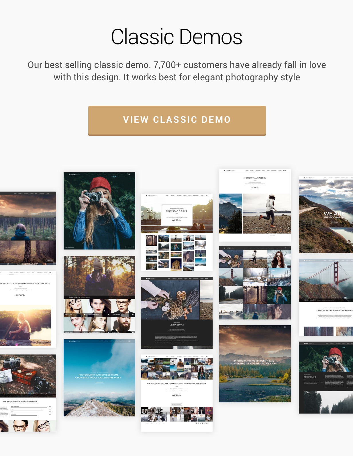 Photography 是一款适用于图片摄影的wordpress主题,该主题设计简洁美观,针对图片做了大量优化,速度绝对令你惊艳,该主题适合摄影爱好者、平面设计师、广告公司使用,支持演示站点一键导入,5分钟建立一款专业的图片摄影网站。